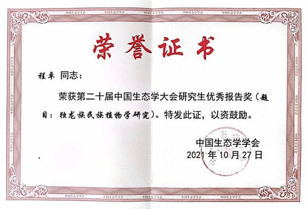 公司龙春林教授指导的博士研究生程卓有幸入选研究生论坛口头报告者之一,并以题为“独龙族民族植物学研究”的报告获得本次大会“研究生优秀报告奖”。