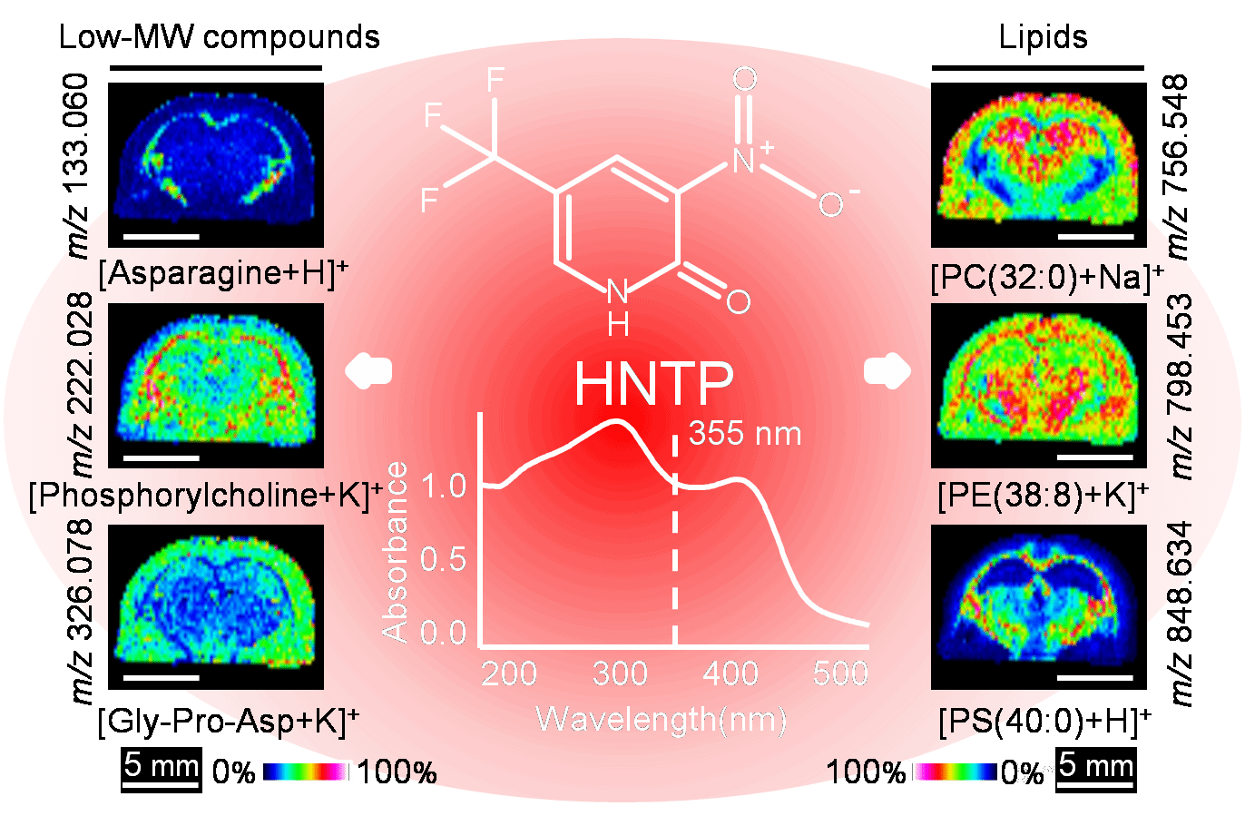 近日,bv伟德(质谱成像与代谢组学国家民委重点实验室)王晓东教授团队与中国中医科公司西苑医院李琦主任医师团队合作在基质辅助激光解析电离质谱成像 (Matrix-assisted laser desorption/ionization mass spectrometry imaging,MALDI-MSI)内源性代谢物检测与成像表征新型基质研究领域取得了又一重要进展。研究发现利用2‑Hydroxy-5-nitro-3-(trifluoromethyl)pyridine( HNTP)新基质结合MALDI-MSI新型分子成像技术,可成功增强对大鼠脑组织中低分子量化合物(<500 Da)与脂质分子的检测与成像表征,显著优于常规基质2,5-dihydroxybenzoic acid(DHB)和2-mercaptobenzothiazole(2-MBT)。该成果近期作为封面文章发表于高水平国际学术期刊Analytical Chemistry。