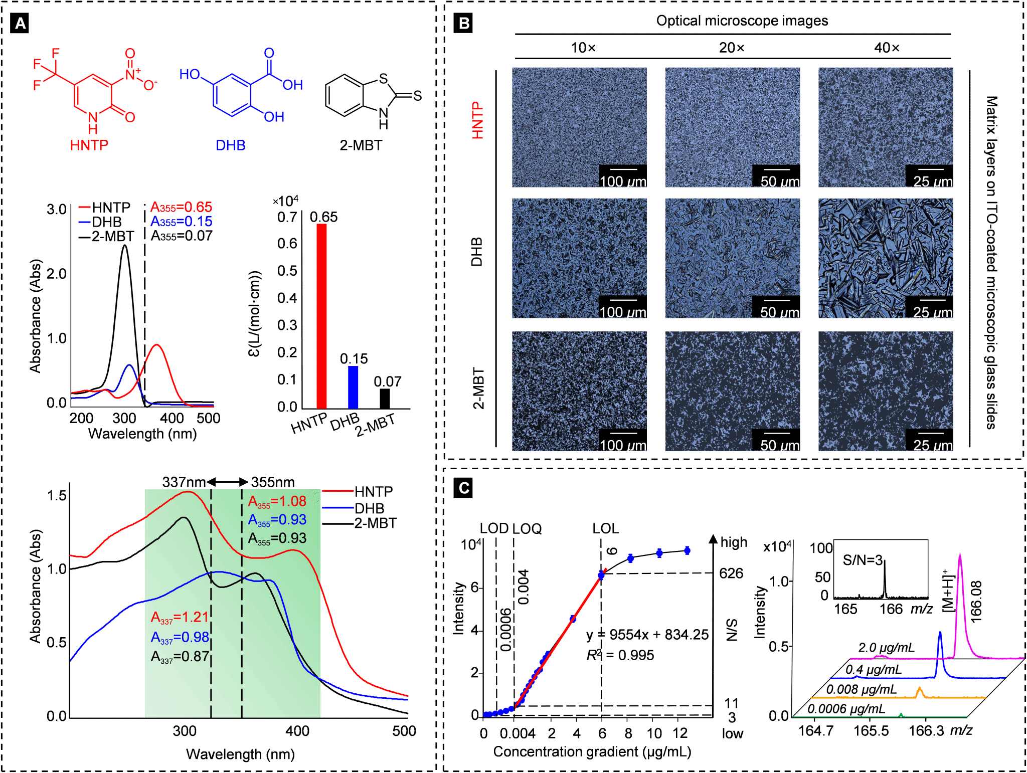 图1. (A) HNTP, DHB, 2-MBT 三种基质的紫外-可见光吸收光谱 (溶液态和固态紫外) 及其摩尔消光系数和化学结构。(B) HNTP, DHB, 2-MBT 三种基质的结晶形态。 (C) HNTP 基质检测氨基酸线性范围。