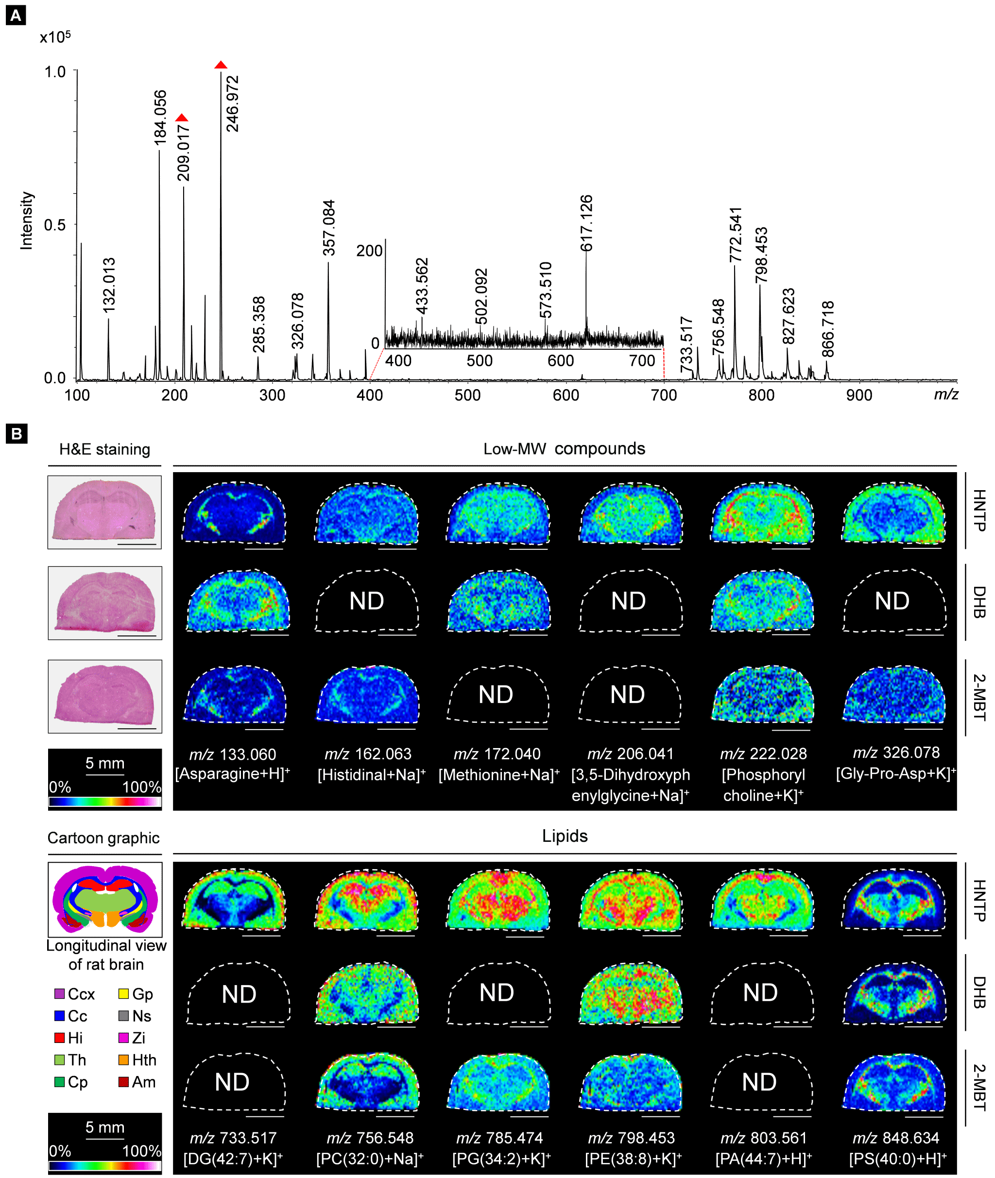 图3. 大鼠脑组织代谢物MALDI-MSI表征。(A)正离子模式下应用HNTP基质检测到大鼠脑组织切片代谢物的MALDI-TOF质谱图。(B) 应用三种基质(HNTP, DHB和2-MBT)所检测到大鼠脑组织切片中选择代谢物离子的成像图。