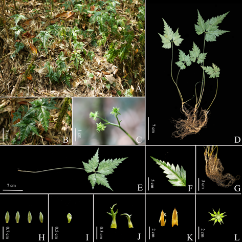 2023年3月,公司博士生程卓在龙春林教授指导下,前往高黎贡山地区开展云南黄连资源的调查,在德宏傣族景颇族自治州盈江县发现一种黄连属植物,与之前记录的形态不同。2024年4月龙春林教授课题组成员再次到发现地采集标本,通过开展形态特征比较和分类鉴定、DNA测序构建系统发育树等方面的研究,确认该物种为黄连属的新物种。基于其发现地点,即高黎贡山南延地区,该新种被命名为南高黎贡黄连(图2)。