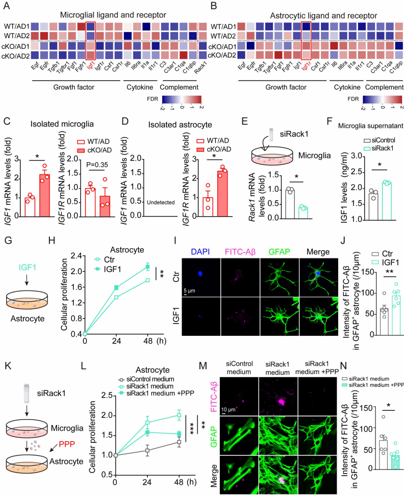 本研究发现了小胶质细胞Rack1缺失通过增强IGF1介导的星形胶质细胞吞噬作用,减少了AD模型小鼠中Aβ沉积和神经炎症,改善了AD模型小鼠的认知障碍,为小胶质细胞-星形胶质细胞互作提供了新见解,也为AD的治疗提供了新的干预靶点和新策略(图7)。