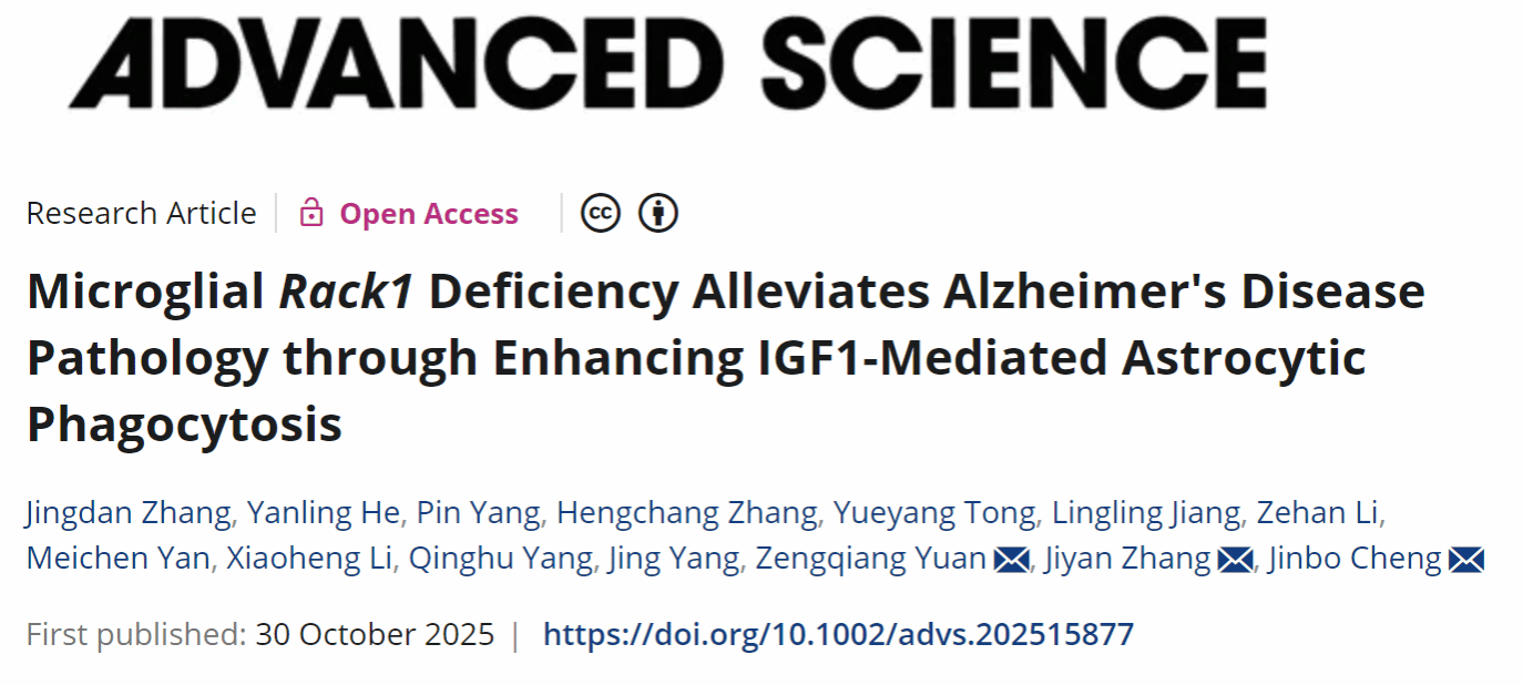 2025年10月30日,程金波教授在阿尔茨海默病致病机制方面取得重要进展,研究成果以“Microglial Rack1 Deficiency Alleviates Alzheimer’s Disease Pathology through Enhancing IGF1-Mediated Astrocytic Phagocytosis”为题发表在国际顶级期刊Advanced Science(中国科公司1区Top,五年影响因子IF=15.6)。