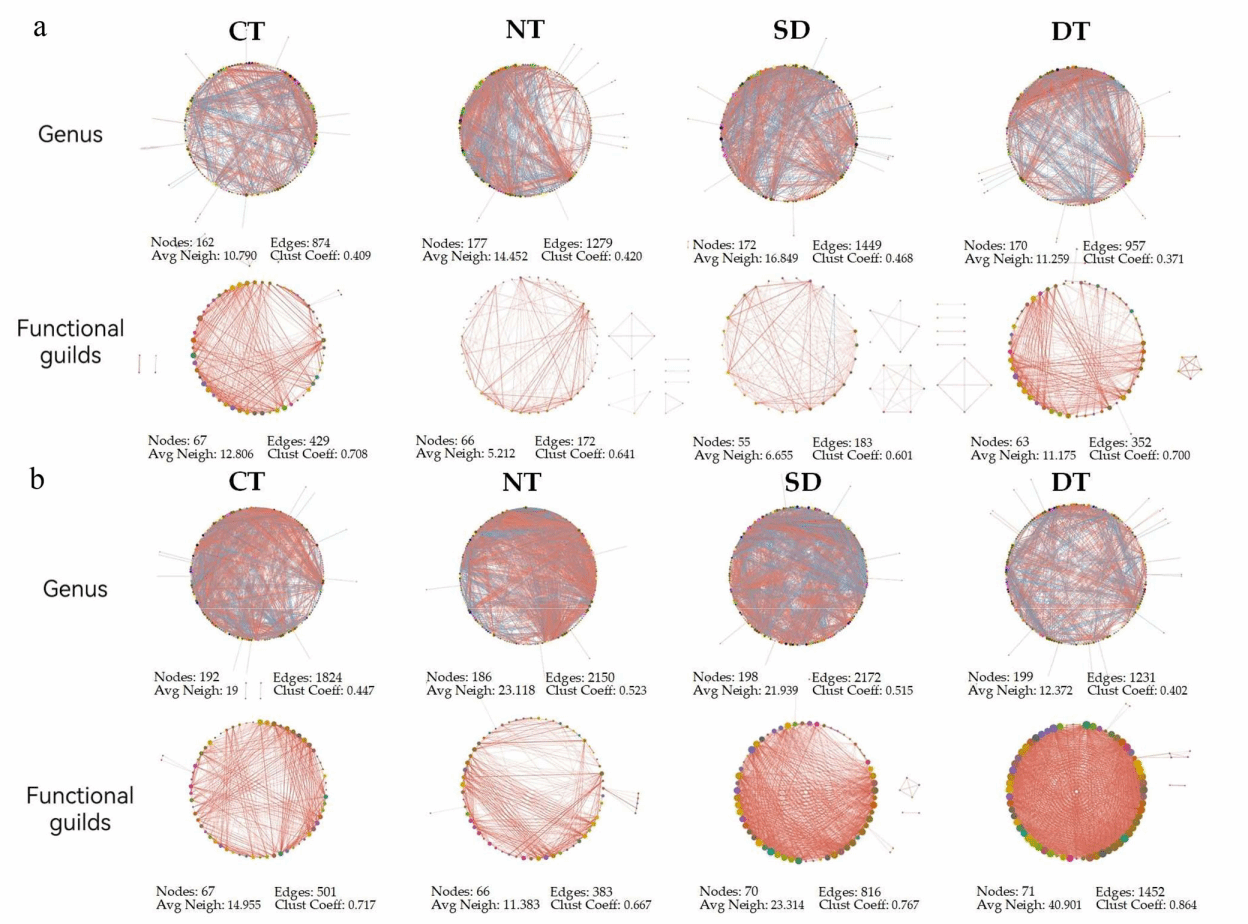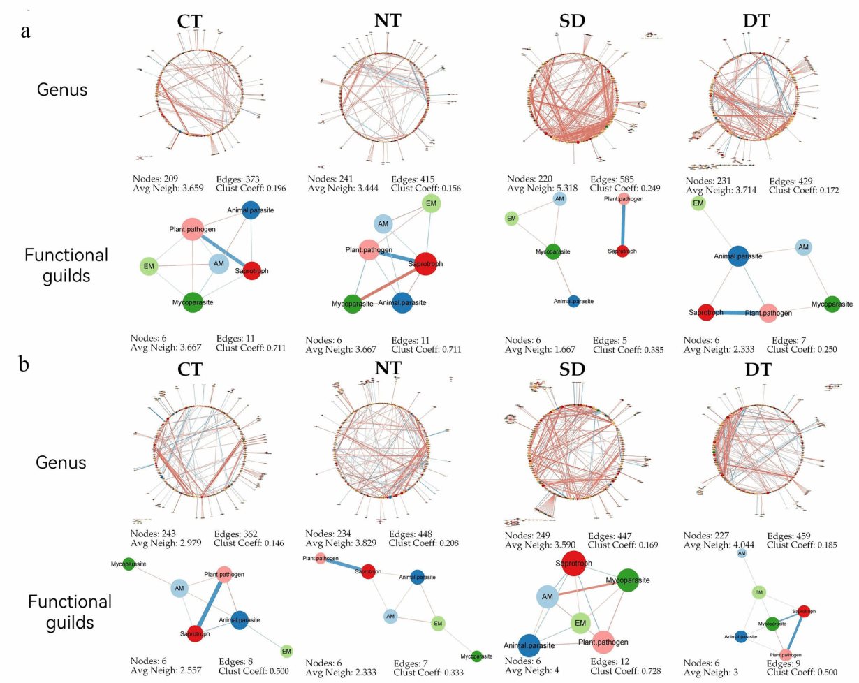 a 内生真菌属及功能群落网络;b根际真菌属与功能群落网络。节点数量、边数、平均邻域数及聚类系数具体网络已经在图下提供。红色和蓝色线条分别表示正相关和负相关,线条粗细对应相关性强度。CT:传统;NT:免耕;SD:错位轮还;DT:深耕。