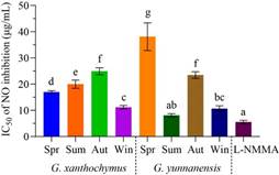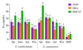 体外细胞毒、抗炎和抗菌生物活性分析表明:大叶藤黄和云南藤黄精油的生物活性显著受到季节性的影响(图2),冬季精油是抗肿瘤和抗炎方面研究的良好资源,而春季精油可能更适合用于开发抗菌剂方面的研究。