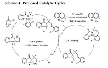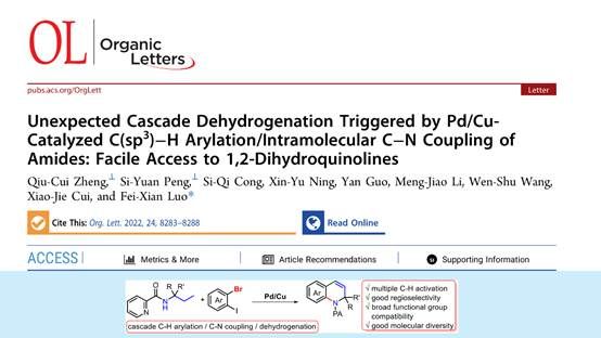 饱和烷烃脱氢制备高价值烯烃是工业生产和合成化学中重要的化学反应,但其苛刻反应条件仍待进一步改进。近年来,利用Pd催化碳氢键活化实现高选择性脱氢反应取得了重要进展,但其底物主要局限于含有酸性活泼氢的羰基类化合物。对于普遍存在的中性惰性碳氢键的烷烃脱氢反应鲜有文献报道。近日,bv伟德罗斐贤研究组利用前期发展的碳氢键活化启动的串联反应策略(Org. Lett. 2019, 21, 1668.),探索Pd/Cu协同催化生物质醇小分子衍生制备的酰胺合成高价值四氢喹啉化合物,意外发现了串联中性碳氢键脱氢反应得到具有重要应用价值的1,2−二氢喹啉分子骨架。通过机理研究证实,该反应首先经历Pd催化分子间碳氢键芳基化反应,接下来Cu催化串联分子内碳氮键偶联和后续Pd催化四氢喹啉β,γ−脱氢反应得到1,2−二氢喹啉化合物,实现了三步反应一锅法高效有序转化。此外,脱氢反应步骤中Ag2CO和卤代烃都至关重要。该研究为烷烃脱氢制备高价值烯烃提供了一种全新策略,具有重要的理论价值和潜在应用价值。相关研究成果以Unexpected Cascade Dehydrogenation Triggered by Pd/Cu−Catalyzed C(sp3)−H Arylation/Intramolecular C−N Coupling of Amides: Facile Access to 1,2−Dihydroquinolines为题在《Organic Letters》(化学1区,有机化学TOP期刊,IF=6.072 (Nature Index收录),Org. Lett. 2022, 24, 8283.)上发表。https://doi.org/10.1021/acs.orglett.2c03203
