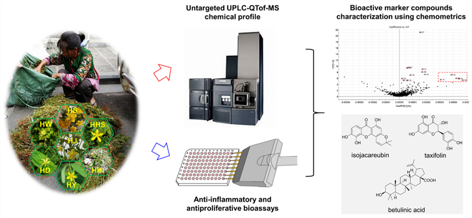 龙春林教授团队与美国纽约城市大学Kennelly教授实验室合作,采用基于UPLC-QTof-MSE技术的非靶向代谢组学结合抗肿瘤细胞增殖活性和体外抗炎活性筛选,对田基黄、遍地金、衡山金丝桃、密腺小连翘、云南小连翘、大理金丝桃、西藏金丝桃7种金丝桃属植物进行化学成分和药理活性研究,基本阐明了这些金丝桃属植物的主要化学成分,揭示了种间化学成分差异,从田基黄中发现并鉴定了13个活性标志物,解释了金丝桃属药用植物传统用药的科学性,为此类植物的开发利用奠定了基础。