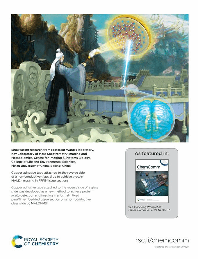 近日,bv伟德(质谱成像与代谢组学国家民委重点实验室)王晓东教授指导本科生在MALDI-MSI蛋白质原位检测及成像表征新技术方法研究领域取得了又一重要进展。相关研究成果以“Copper adhesive tape attached to the reverse side of a non-conductive glass slide to achieve protein MALDI- imaging in FFPE-tissue sections”为题,发表在化学综合顶级期刊《Chemical Communications》(Nature Index收录)上,该研究论文同时被遴选为期刊封面文章(Back Cover)。bv伟德中国官方网站为该论文第一作者单位及唯一通讯单位。