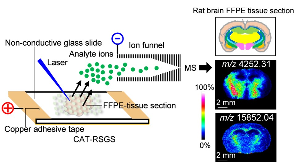 王晓东教授团队指导本科生成功开发出了一种利用MALDI-MSI在非导电玻片上实现FFPE组织切片蛋白原位检测和成像的新方法(CAT-RSGS)。该方法将导电铜胶带(87 mm×25 mm)对称地粘贴至附有待检测FFPE组织的非导电玻片(75 mm×25 mm×1mm)的背侧,用以实现非导电玻片高电压的成功加载与离子驱动电场的形成。研究团队利用该方法成功进行了非导电玻片上蛋白质/多肽标品的检测,并将其应用于非导电玻片小鼠脑FFPE组织切片中内源性蛋白质的MALDI原位检测和成像。新方法的使用顺利实现了223种蛋白质离子信号的成功表征,明显优于AnchorChip不锈钢金属导电靶板(163种蛋白质离子信号)及ITO导电玻片(145种蛋白质离子信号)的检测性能。此外,相较于依托ITO导电玻片和AnchorChip靶板原位检测与成像重构结果,基于CAT-RSGS技术表征的蛋白质离子信号图像在小鼠脑冠状组织切片中显示出更为理想的异质性分布,充分证实了CAT-RSGS新方法在非导电玻片FFPE组织上原位表征蛋白质组织空间分布的优势及潜在应用价值。此外,研究团队也成功揭示了CAT-RSGS技术在高真空条件下的良好稳定性能,并证明了该技术对非导电玻片新鲜冷冻组织切片内源性分子原位检测方面也具一定的广谱适用性。考虑到全世界范围内医院或相关研究机构已储存的数以亿计的FFPE病理组织切片,CAT-RSGS的广泛应用将极大地拓展这些珍贵样品在空间蛋白质组学MALDI成像中的充分利用及有效信息的充分挖掘。