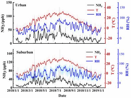 图2.城郊区NH3、温度(T)和相对湿度(RH)时间序列变化