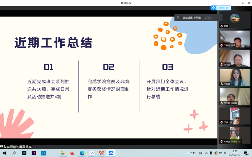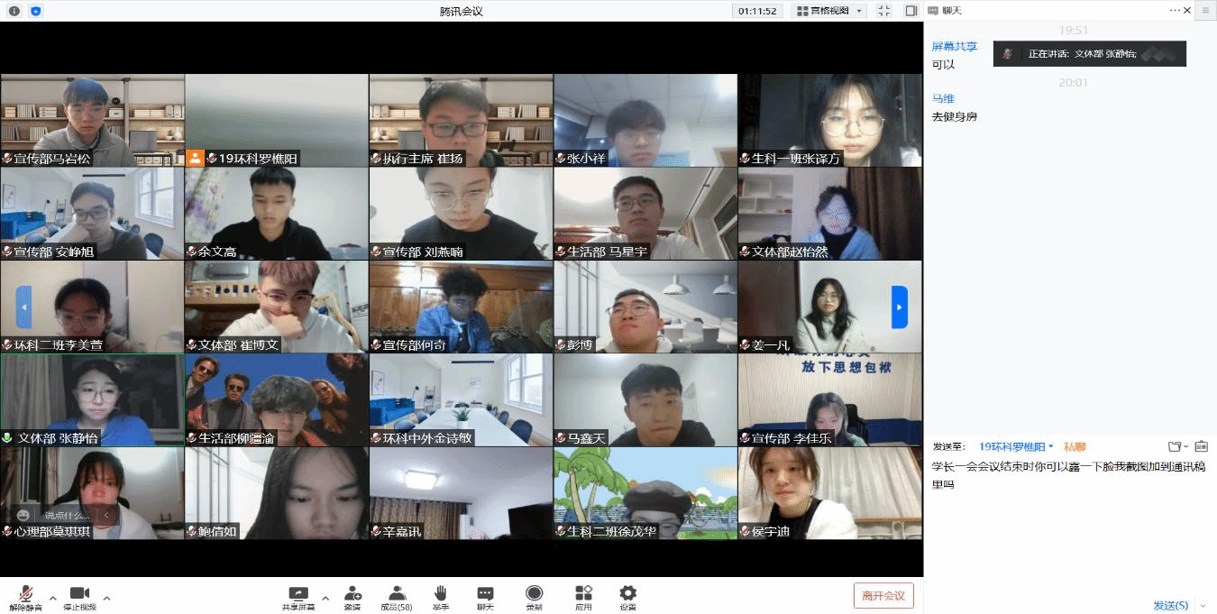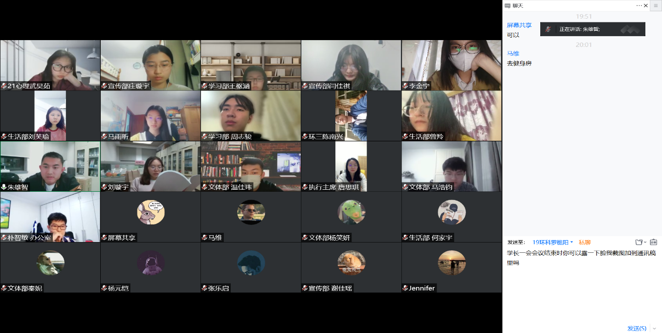 随后,执行主席唐思琪发言。她对分管的心理部与宣传部进行的工作做出总结并提出未来展望。她强调部门工作要发挥自身特色,做好同学们居家学习的心理监督及疏导作用以及通过宣传媒介做好大家的思想引导工作。她还希望同学们能够调整心态,反思沉淀,充分利用好居家学习的时间。