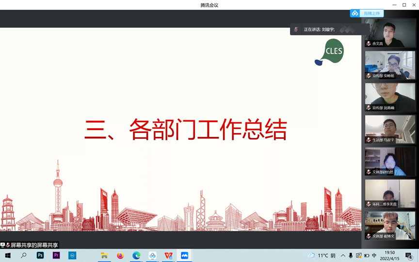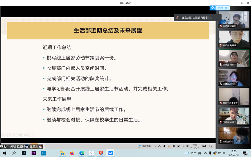 会议伊始,刘璇宇老师对近期员工会工作进行总结,并对今后工作提出规划安排。首先,刘璇宇老师对各部门的整体工作表示肯定,她希望各成员砥砺前行,用昂扬的工作态度来办好即将到来的各项活动及日常事宜。此外,她希望员工会成员能够以身作则,引导气氛,维持同学们乐观向上的居家学习状态。最后,她希望同学们能够健康、安全地居家生活,并期待与大家再次相聚。