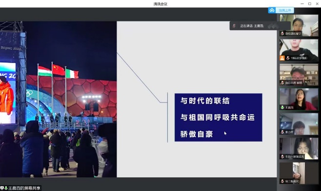 王晨百同学为大家分享了自己在冬奥会期间担任志愿者的经历及感受。首先,王晨百同学以一句“助人者自助,乐人者乐己”为引,讲述了自己参加冬奥志愿者的原因,她希望用自己的力量去守护冰雪荣光,守护团结,守护希望。随后,她为同学们介绍了北京冬奥颁奖广场和延庆残奥颁奖广场,让大家对冬奥的场馆建设有了更深入的了解。在冬奥会期间王晨百作为志愿者领域综合组组长,不仅要负责统计数据、组织召开例会,更要负责策划活动、对接交通、对接餐饮等工作,被大家亲切称为“志愿者的志愿者”,她向大家分享了自己在这个过程中收获的宝贵经验和珍贵友谊。作为这次冬奥会的亲身参与者她切身感受到了什么是与祖国同呼吸共命运,同时她也为祖国的强大深感骄傲与自豪。
