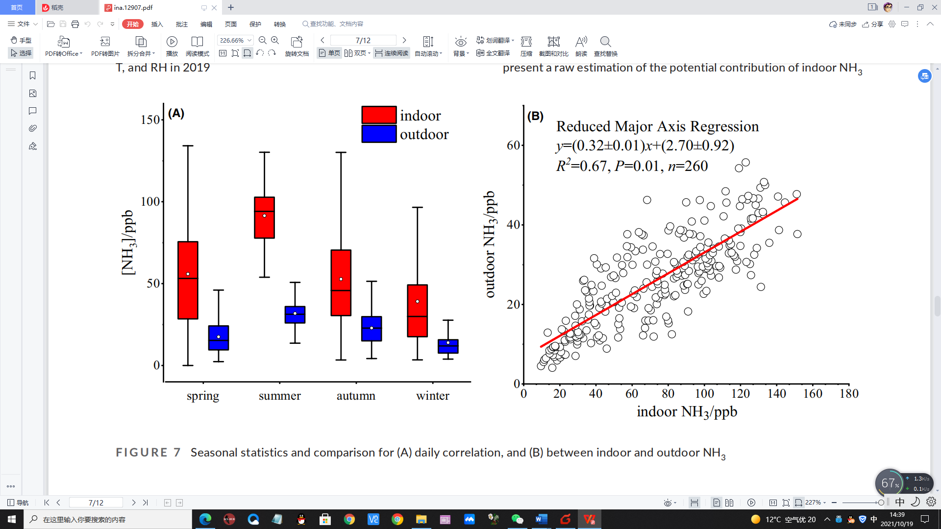 FIGURE Seasonal statistics and comparison for (A) daily correlation, and (B) between indoor and outdoor NH3