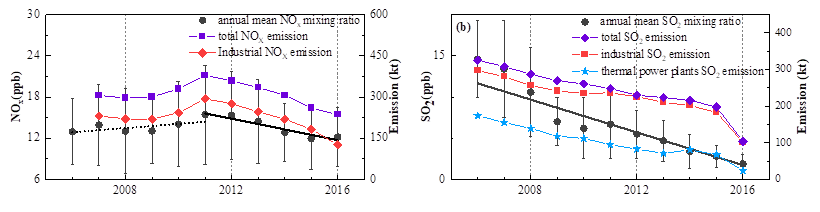 林伟立教授团队与临安区域大气本底站合作,基于地面长期观测结果,首次分析了长三角背景地区2006‒2016年NOx和SO2的长期变化特征及影响因素。结果表明,长三角地区NOx以+0.31 ppb/yr的速度波动上升至2011年后以‒0.78 ppb/yr的速度逐年下降,SO2以‒0.99ppb/yr的速度逐年波动下降,二者与长三角地区总排放量和工业总排放量的变化均显著相关(P<0.001)。SO2和NOx年均值之比逐年下降,说明长三角地区大气中SO2管控效果明显优于NOx,未来需要加强对NOx排放量的管控。