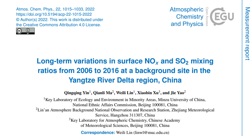 长期、准确的背景大气成分观测是认识区域污染根源的基础性工作,也是研究和评估污染控制措施有效性的科学依据。近来,林伟立研究员团队在NOx和SO2两类污染气体的长期监测研究上取得重要进展,研究成果以“Long-term variations in surface NOx and SO2mixing ratios from 2006 to 2016 at a background site in the Yangtze River Delta region, China”为题发表在Atmospheric Chemistry and Physics(地球科学1区)上,文章链接https://doi.org/10.5194/acp-22-1015-2022。