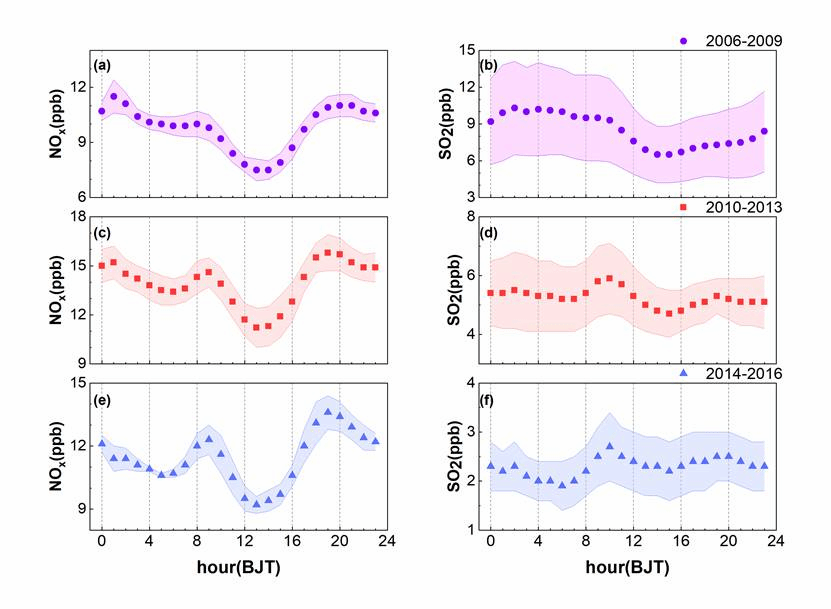 图2.临安大气背景站NOx和SO2平均日变化的长期变化特征