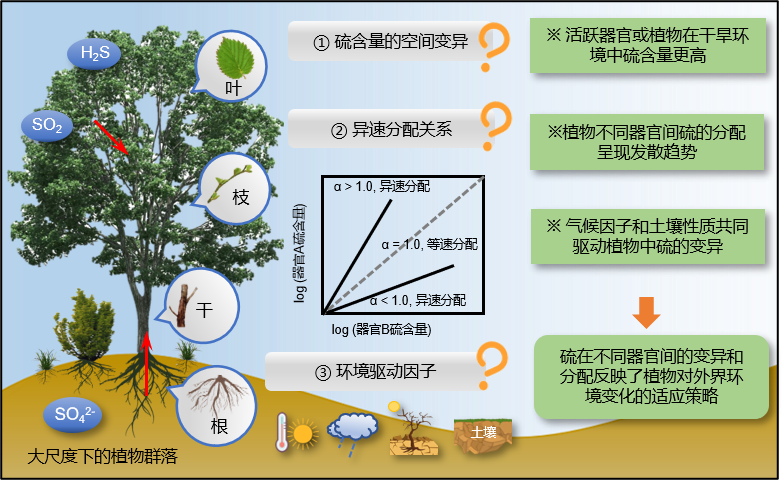 S主要以硫酸盐(SO42–)的形式通过根系从土壤中吸收,再被运输到不同器官,参与植物的生理生化活动。功能元素在不同植物器官间的分配规律,与生态系统内植物养分获取策略、物质循环和能量流动等密切相关。因此,调整不同器官间营养元素的异速生长关系(scaling relationship)常被认为是植物适应环境的重要机制。目前在大尺度下,对此进行的大多数研究都集中在大量元素C、N和P或单个器官(如叶或根)。