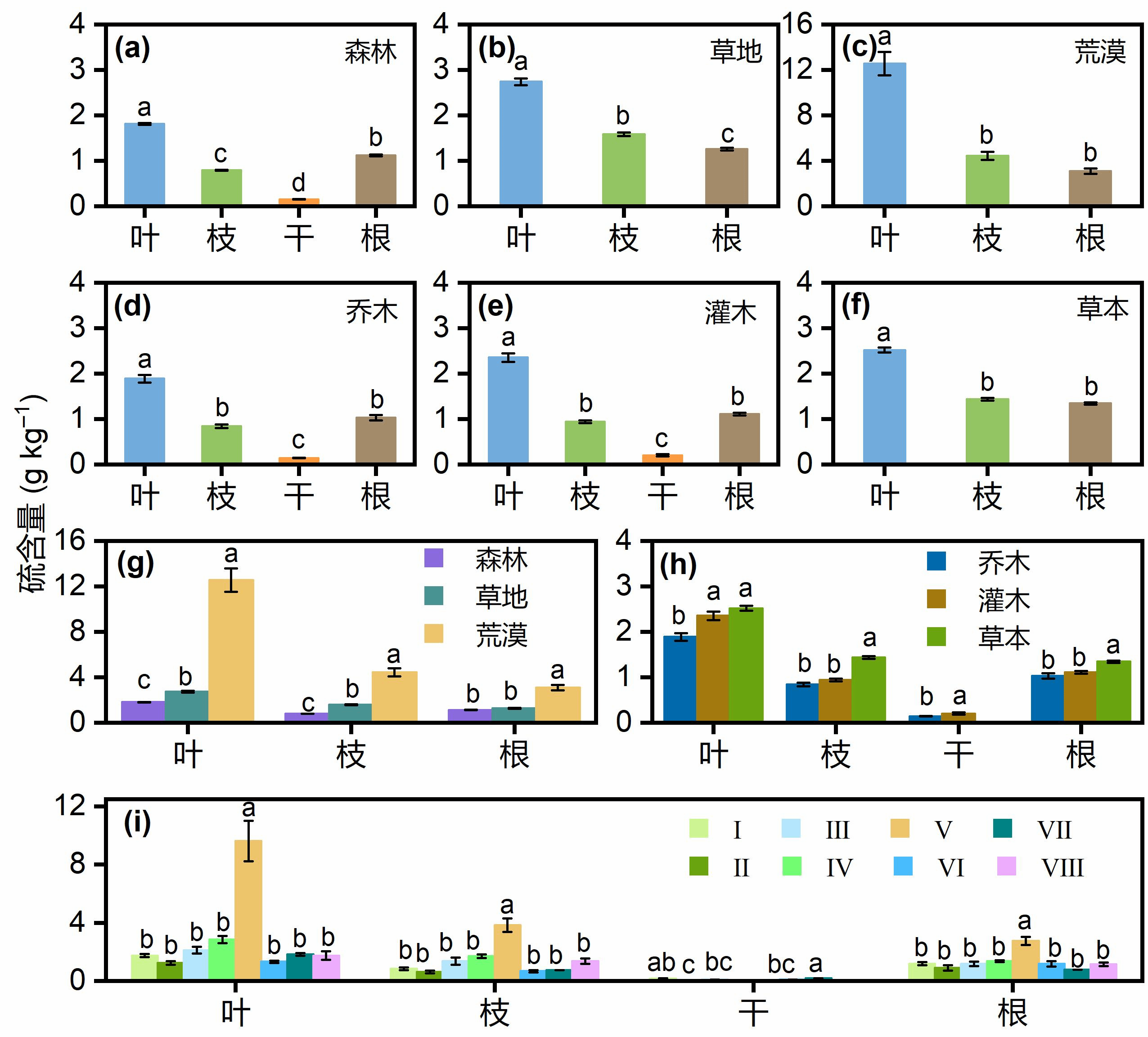 图3不同生态系统和植物生长型中不同器官的硫含量差异