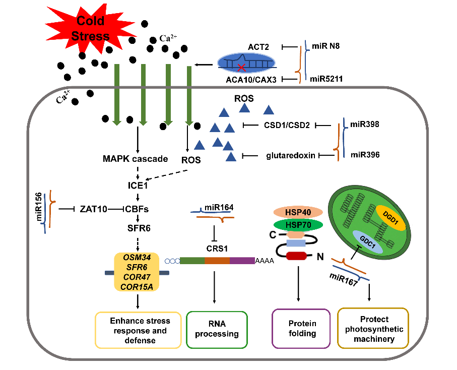 生理指标检测结果显示,低温驯化通过增强细胞的渗透压、减少光合机构的损伤、激活抗氧化酶活性等多种方式提高了西蒙得木的低温耐受性。多组学联合分析发现多个基因调控模块可能在西蒙得木响应低温驯化过程中发挥了重要作用,其中ICE1-CBF-SFR6通路激活了与冷胁迫相关的植物防御反应,miR398-CSD1/2和miR396-glutaredoxin参与调节ROS的稳态平衡,miR167-GDC1与光合作用的维持相关(图2)。本研究结果有助于深化对植物低温驯化分子机制的认识,为西蒙得木引种栽培和耐低温育种提供了重要数据。