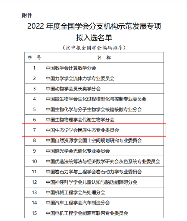 入选中国科协2022年度全国学会分支机构示范发展专项是对“民族生态专业委员会”自成立以来为繁荣民族生态科学事业、推进生态文明建设、提高全民生态意识各项工作的肯定。“民族生态专业委员会”将以此为契机,认真开展工作,为公司生态学学科——民族生态学特色方向的建设和人才培养作出更大的贡献。