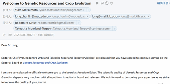 近日,应Springer Nature出版集团医药与生命科学部高级官员Yuko Matsumoto博士的邀请,龙春林教授出任该集团权威期刊Genetic Resources and Crops Evolution(遗传资源与作物进化)副主编(Associate Editor)。