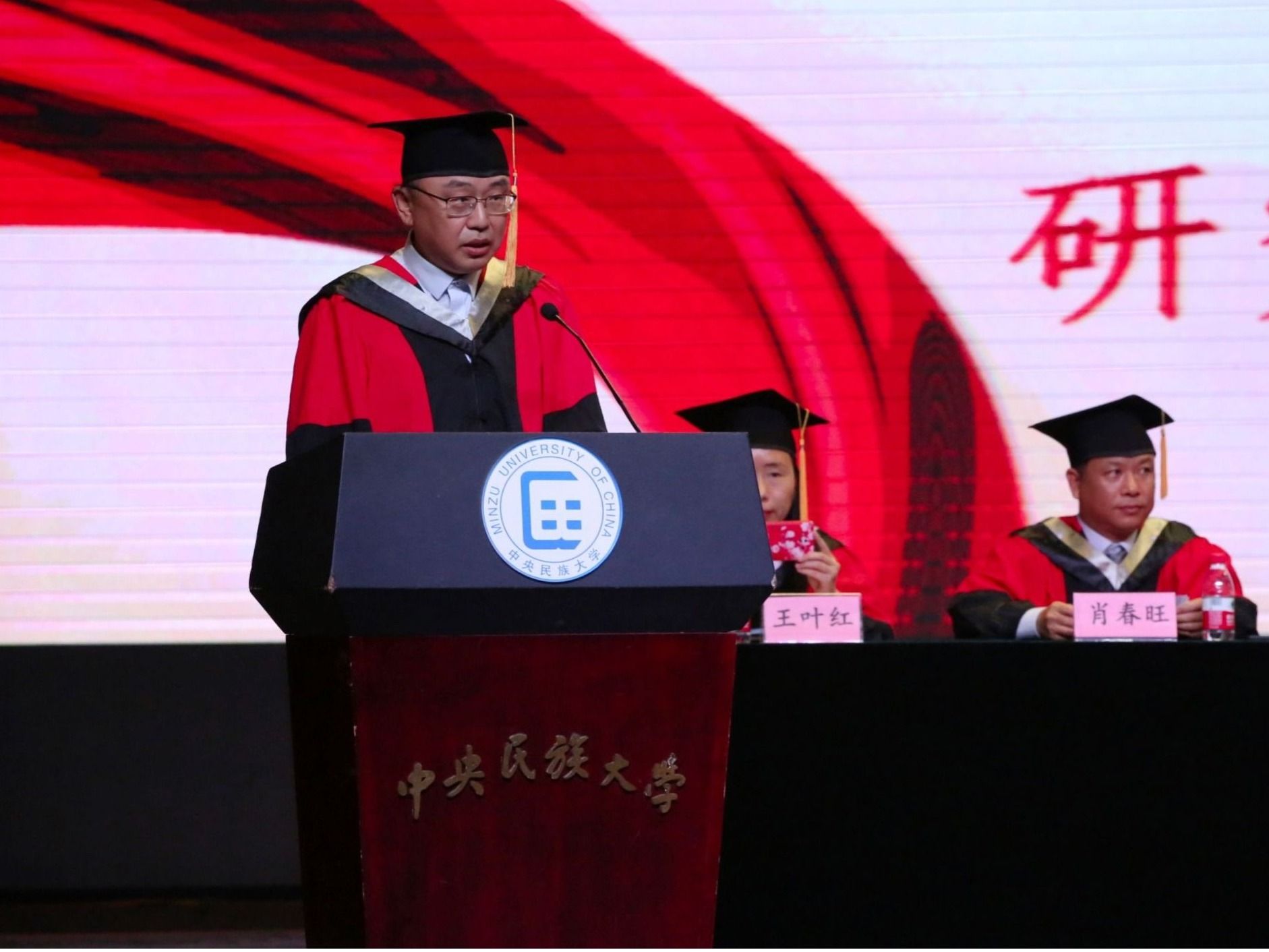 集团第二届优秀研究生导师肖春旺教授代表教师致辞,首先祝贺各位同学圆满完成学业,并表示在同学们身上时时刻刻感受着敢想敢为的热情和不屈不挠的斗志,体会到了教学相长的快乐,希望同学们从民大出发不惧风雨,勇敢向前!