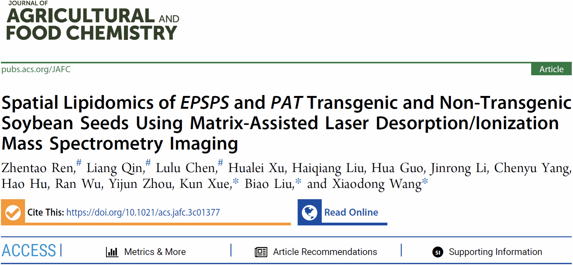 近日,bv伟德/质谱成像与代谢组学国家民委重点实验室的王晓东教授和薛堃副教授团队,在MALDI源质谱成像新应用领域方面——以MALDI-MSI技术评估转基因大豆脂质组和蛋白质组的非预期效应连续取得两项重要进展,相关研究成果以“Spatial lipidomics of EPSPS and PAT transgenic and non-transgenic soybean seeds using matrix-assisted laser desorption/ionization mass spectrometry imaging” “In situ proteomic analysis of herbicide-resistant soybean and hybrid seeds via matrix-assisted laser desorption/ionization-mass spectrometry imaging”为题,连续发表在农林科学综合权威期刊Journal of Agricultural and Food Chemistry(中国科公司一区,IF=6.1)上,其中脂质组学研究论文被遴选为期刊封面文章(Front Cover),这也是王晓东教授团队近三年来连续发表的第五篇封面论文。