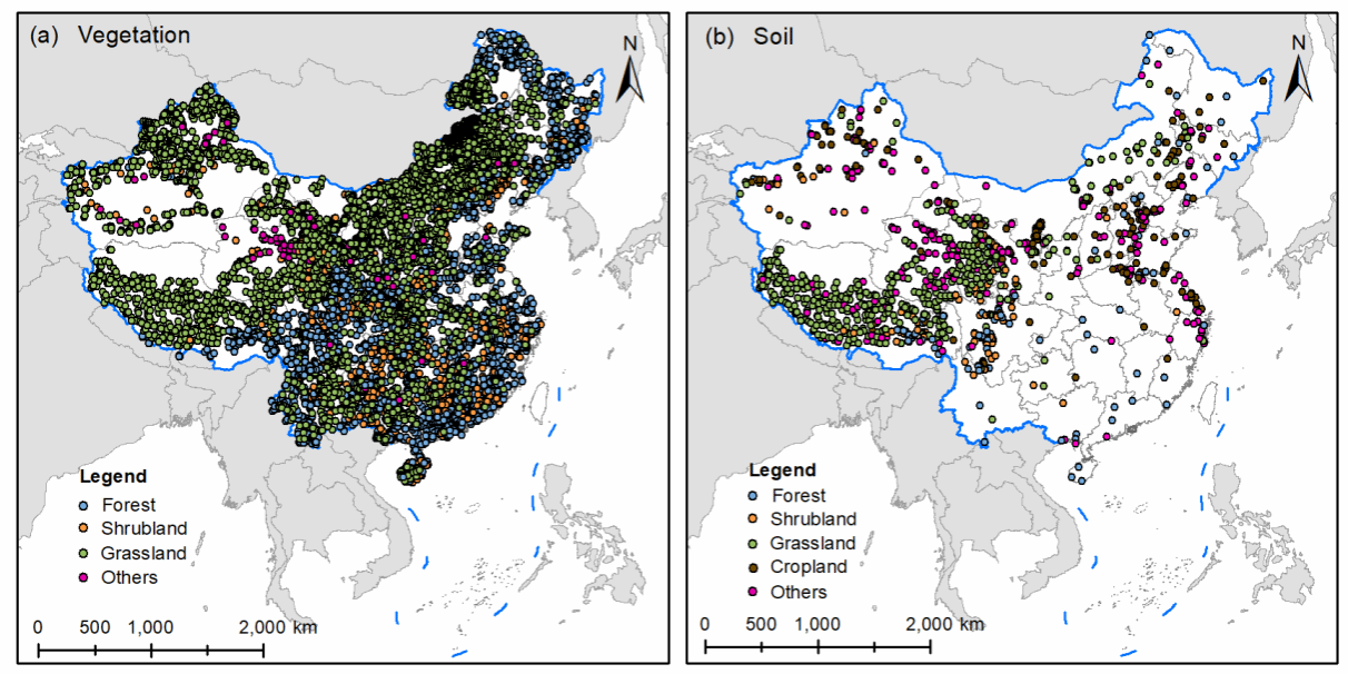 有关野外实测数据系统地估算植被和土壤中的硫储量目前报道较少。致使我们在现有的研究基础上难以真正了解陆地生态系统硫储量分布格局及其驱动因素。为此,本研究通过整合野外调查获得的实测数据和已发表的文献数据,构建了包含17618个自然群落的植被(包括叶、枝、干和根)和表层土壤(0–30 cm)硫含量和硫密度数据库(图3)。