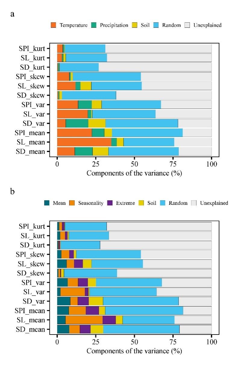 研究结果显示草地群落的气孔密度和气孔面积指数的群落加权平均值显著小于森林群落,表明草地群落采取了更为保守的生态策略来降低水分的消耗。草地群落的气孔密度和气孔面积指数的群落加权方差显著小于森林群落,这符合环境过滤假说的预测-环境不利的条件下会导致群落内性状分布的收敛。气孔密度和大小的权衡关系已经在物种水平上被广泛验证,研究发现这种权衡关系在群落水平上依旧稳健 (图2),表明调控气孔性状演化的因素与控制群落构建的因素可能是相同的。相比于群落加权偏度和峰度,群落加权平均值和方差更受到环境因素的影响。气孔密度的群落加权平均值和方差主要受到降水因子的影响,而气孔大小的群落加权平均值和方差主要受到温度因子的影响。传统观点认为年均温和年降水和影响性状变异的重要因素,研究结果表明气候的波动性、极值可能比年均温和降水在调控气孔性状变异上发挥更为重要的作用(图3)。群落尺度气孔大小-环境的关系在森林和草地是相对一致的,但气孔密度-环境的关系在森林和草地中是不一致的,这不符合基于性状生态学(trait-based ecology)的前提假设,新一代基于性状的全球生态模型应考虑性状-环境并不完全一致的因素。