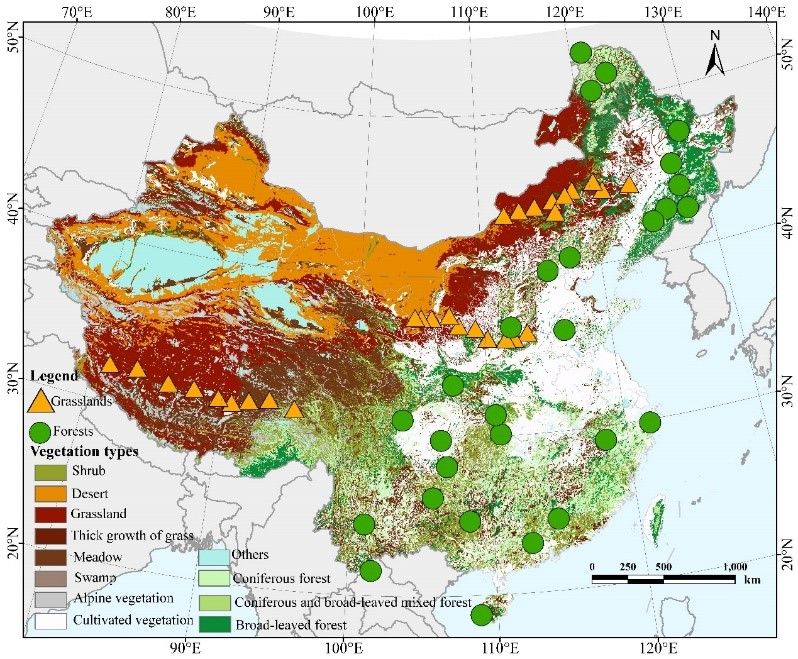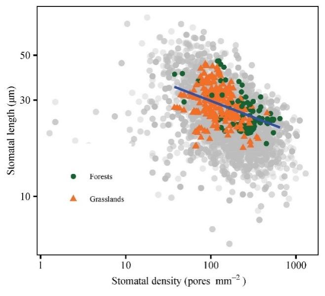 气孔是叶表皮上的小孔,由一对保卫细胞构成,它的开闭调节着叶片与大气间二氧化碳和水蒸气的交换。植物通过气孔主要以两种方式优化单位水分损失的碳固定,一是短期的气孔开闭行为,二是长期的历史形态演化,这些形态主要包括气孔的密度和大小等。在跨物种的研究中,气孔密度和大小间的权衡关系已经被验证。大量研究发现,气孔性状很大程度上影响植物的抗旱性和水分利用效率,因此气孔性状已经在生态和农业等多个领域得到了广泛的关注。事实上,群落尺度而不是物种水平的植物性状决定生态系统功能。虽然气孔性状已经引起了科学家的重视,但气孔性状的研究尺度尚未拓展到群落水平。因此,群落尺度上探究气孔性状的变异及其环境驱动因素对于理解气候变化如何影响生态系统生产力和水分利用效率等生态系统功能具有重要意义。