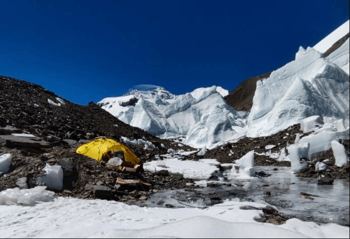 随着大本营观测顺利开展,林伟立教授留守大本营负责该营地的仪器观测及大气样品罐采样工作。2022年4月29日,陈熠博士在北京大学环境科学与工程公司叶春翔老师的带领下,与其他两位博士研究生一起徒步6.5小时到达5800米营地宿营。翌日,陈熠与其他3人前往5950米附近建立新的观测营地,开展冰雪表面NOx通量、臭氧、黑碳、大气不同粒径颗粒物浓度、光解速率常数等观测以及冰雪样品的采样。陈熠博士同时负责5950米处大气中CO2、CH4和持久性有机物的罐采样。5月6日,在5800和5950米的观测顺利完成后,小分队成员和仪器物资等安全撤回大本营。期间,通过仪器交接,冲顶登山运动员带着来自民大的臭氧测量小仪器分别获得了6400米和8300米附近的臭氧浓度,创造了首次在地面直接测量臭氧的新高度。
