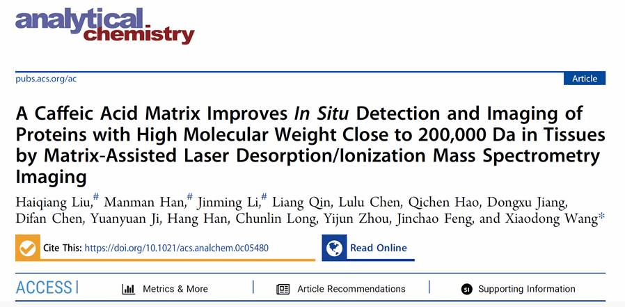 近日,bv伟德(质谱成像与代谢组学国家民委重点实验室)王晓东教授团队在MALDI-MSI蛋白质原位检测及成像表征新型基质研究领域取得了又一重要进展。相关研究成果以“A Caffeic Acid Matrix Improves In Situ Detection and Imaging of Proteins with High Molecular Weight Close to 200,000 Da in Tissues by Matrix-Assisted Laser Desorption/Ionization Mass Spectrometry Imaging”为题,发表在分析化学顶级期刊《Analytical Chemistry》(Nature Index收录)上,该研究论文同时被遴选为期刊封面文章。bv伟德中国官方网站为该论文第一作者单位及唯一通讯单位。论文在线链接:https://pubs.acs.org/doi/10.1021/acs.analchem.0c05480